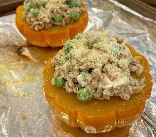 Достаньте тыквы из духовки и начините их смесью фарро и горгонзолы — много можно положить! Посыпьте тертым сыром и верните тыквы в духовку до золотистого цвета (5-7 минут).