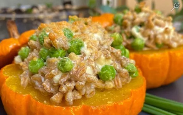 Чтобы сделать начинку из тыквы, смешайте пшеницу фарро (еще горячий) с сыром горгонзола, сливочным сыром и горошком. Добавить соль и перец по вкусу.