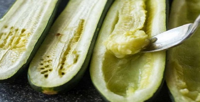 2. Разрежьте кабачки вдоль пополам и ложкой выскребите внутреннюю часть кабачков, оставив достаточно места для начинки из индейки.