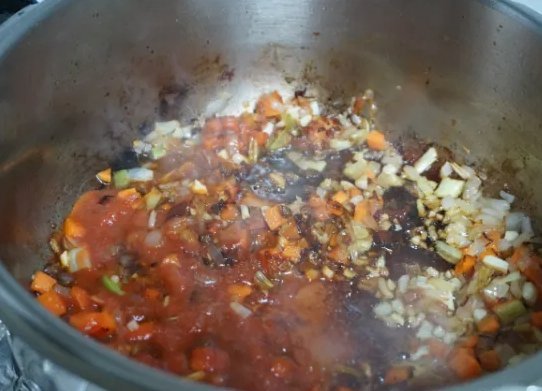 В ту же сковороду, где вы жарили кролика, добавьте еще немного масла и овощи. Дайте им потушится и добавьте жареный помидор. Перемешайте, чтобы не слиплось.