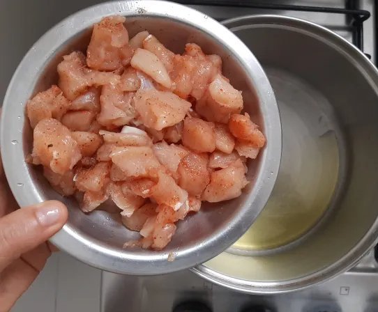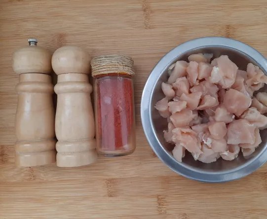 Приправьте нарезанную кубиками куриную грудку солью, черным перцем и паприкой.