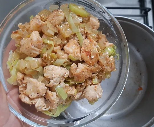 Верните этот взбитый бульон в кастрюлю и добавьте предварительно обжаренную курицу, хорошо перемешав.