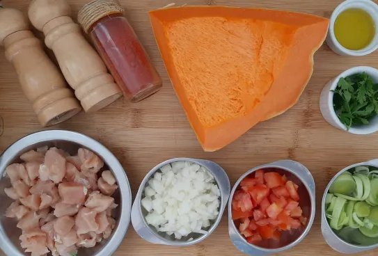 Соберите все ингредиенты, необходимые для приготовления тыквенного супа с курицей.